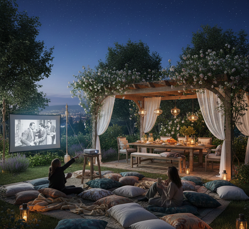 Create a magical atmosphere by setting up an outdoor movie screening area. Use a projector and a white sheet or a specialized screen, and provide cozy blankets and cushions for a unique cinema experience under the stars.