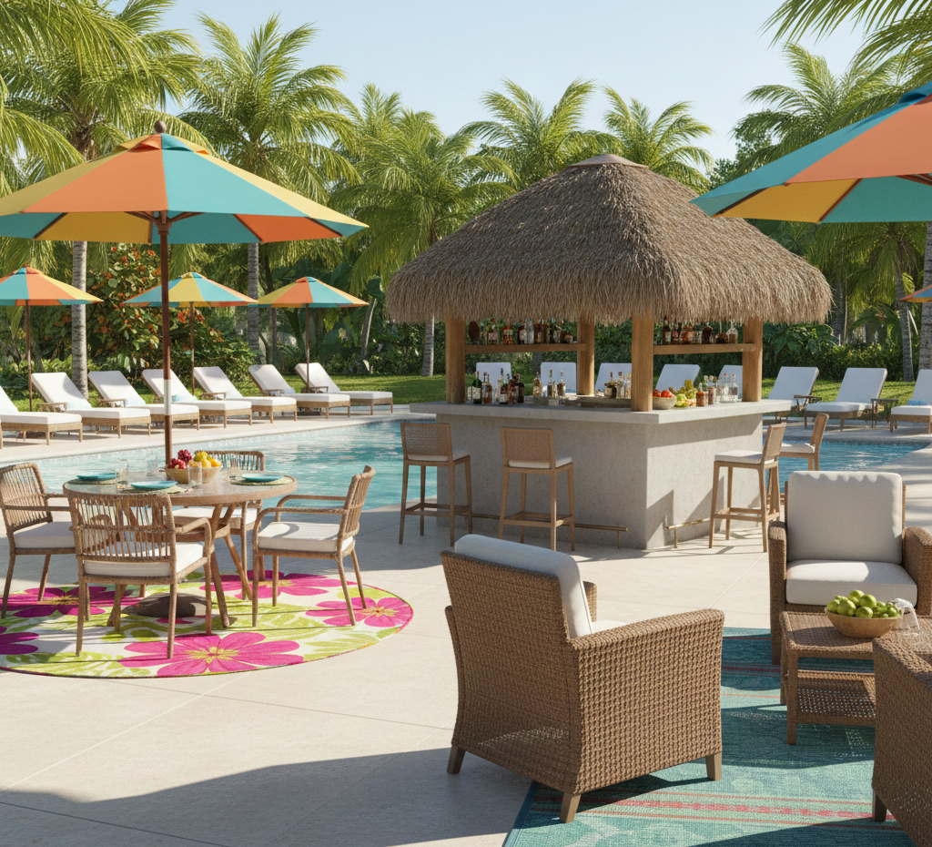 Add personality to your outdoor space with colorful rugs. They create warmth and comfort, defining the areas for dining or lounging while adding an extra touch of style.