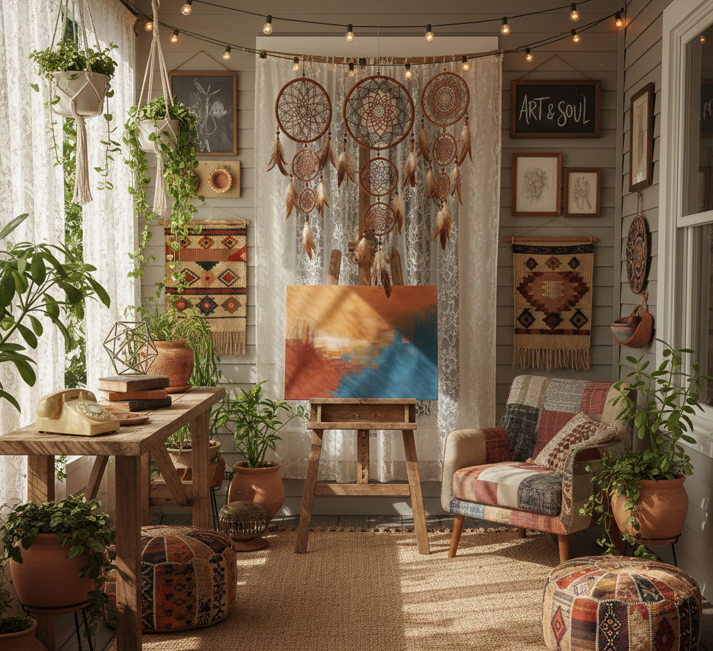 Boho style is all about personal expression, so don’t hesitate to showcase your artistry. Display your paintings, dreamcatchers, or handmade crafts on your porch. This will not only personalize your space but also spark creativity.