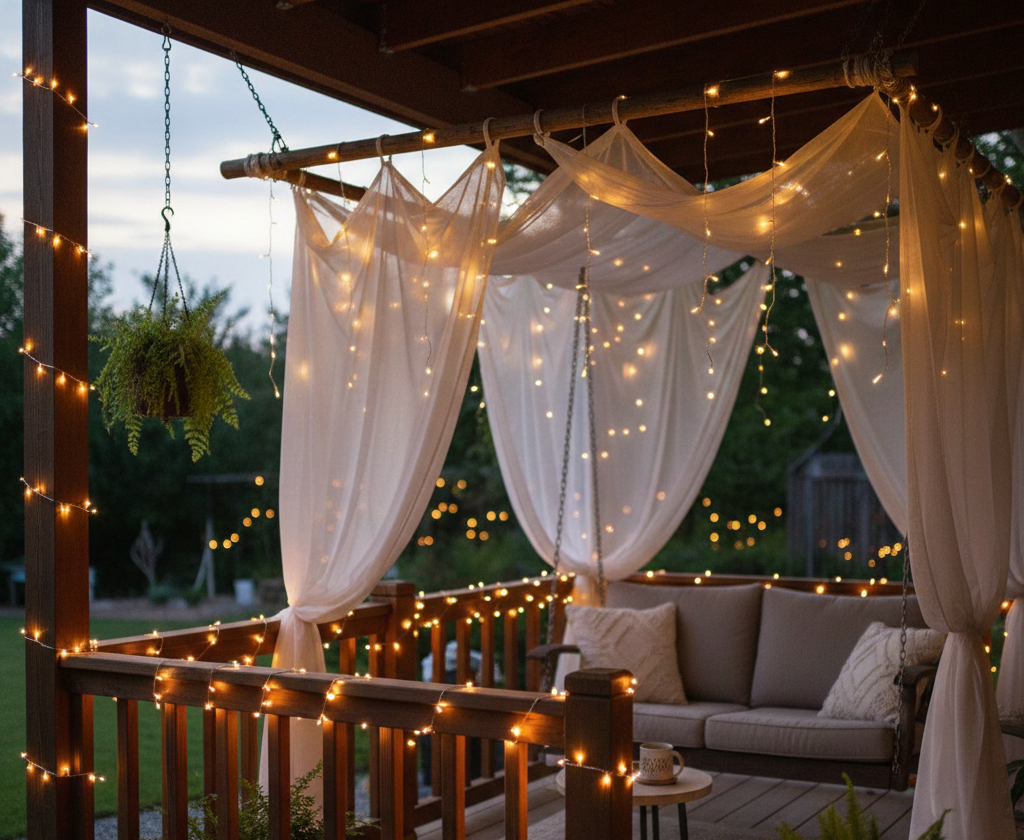Set up a dreamy canopy using lightweight fabric or sheer curtains. Drape them across your porch ceiling or use a DIY frame to create a cozy retreat. This adds a romantic touch while providing shade during sunny days.