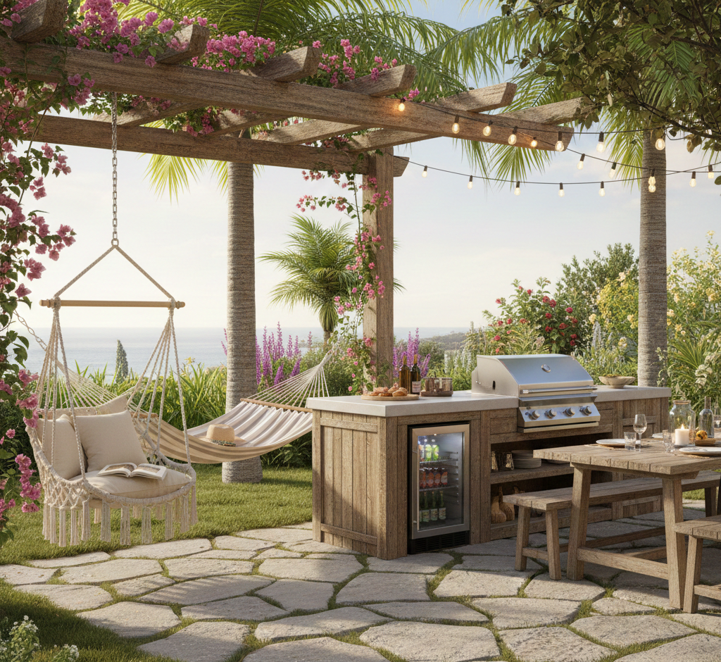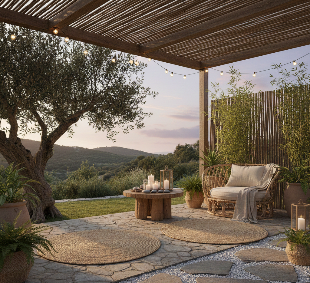 Use wooden furniture and natural materials to bring an organic feel to your outdoor space. Add bamboo or rattan accents for an earthy vibe that complements nature.