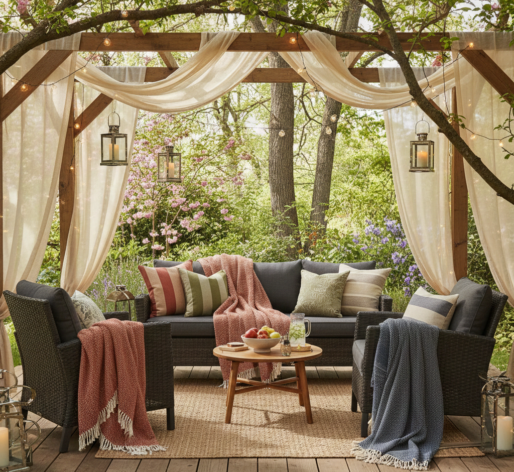 Add soft blankets and decorative pillows to your seating. This not only enhances comfort but also adds color and texture to your decor. Choose weather-resistant fabrics that can withstand the elements.