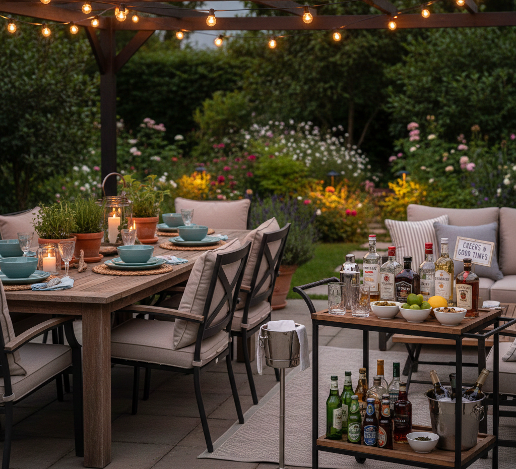 Add a stylish bar cart for drinks and snacks. Stock it with your favorite beverages and cocktails, and it will soon become the centerpiece of your outdoor gatherings.