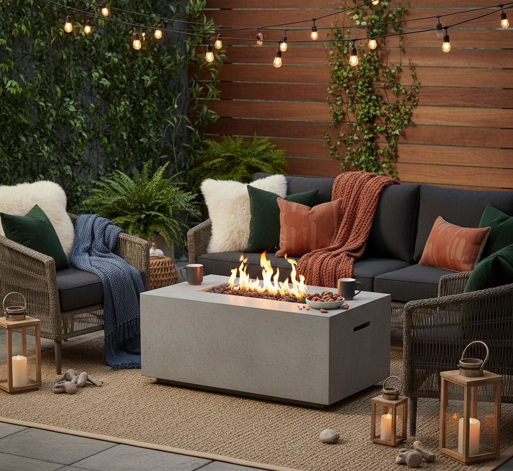 A fire table is a superb option for warmth and ambiance without needing a full fire pit. It serves as both a heat source and a functional table for drinks and snacks, perfect for evening gatherings.