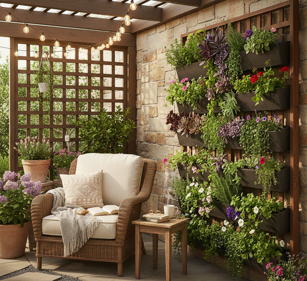 Maximize your space with vertical gardens that can be as simple as wall-mounted planters. Herbs, succulents, and flowering plants can thrive in this arrangement while adding lushness to your retreat.