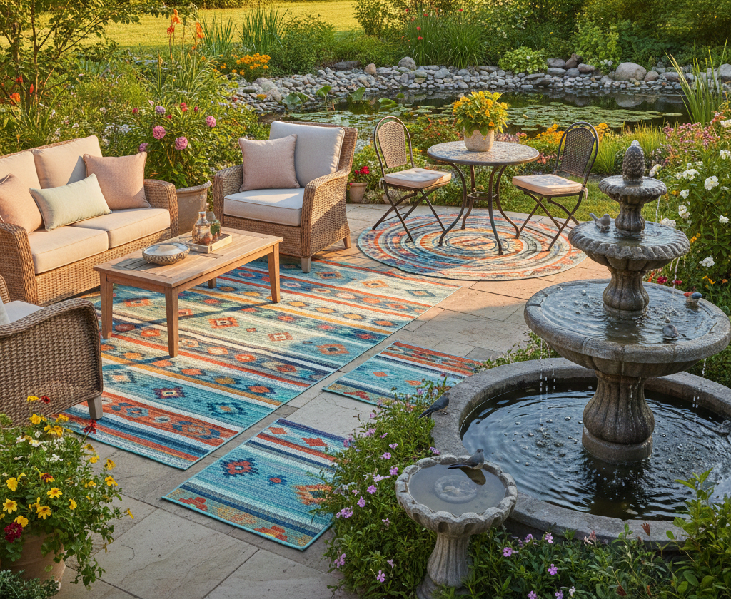 Add warmth and style to your patio or deck with vibrant outdoor rugs. They define your seating area while providing a soft place for your feet to land. Opt for weather-resistant materials for maximum durability.