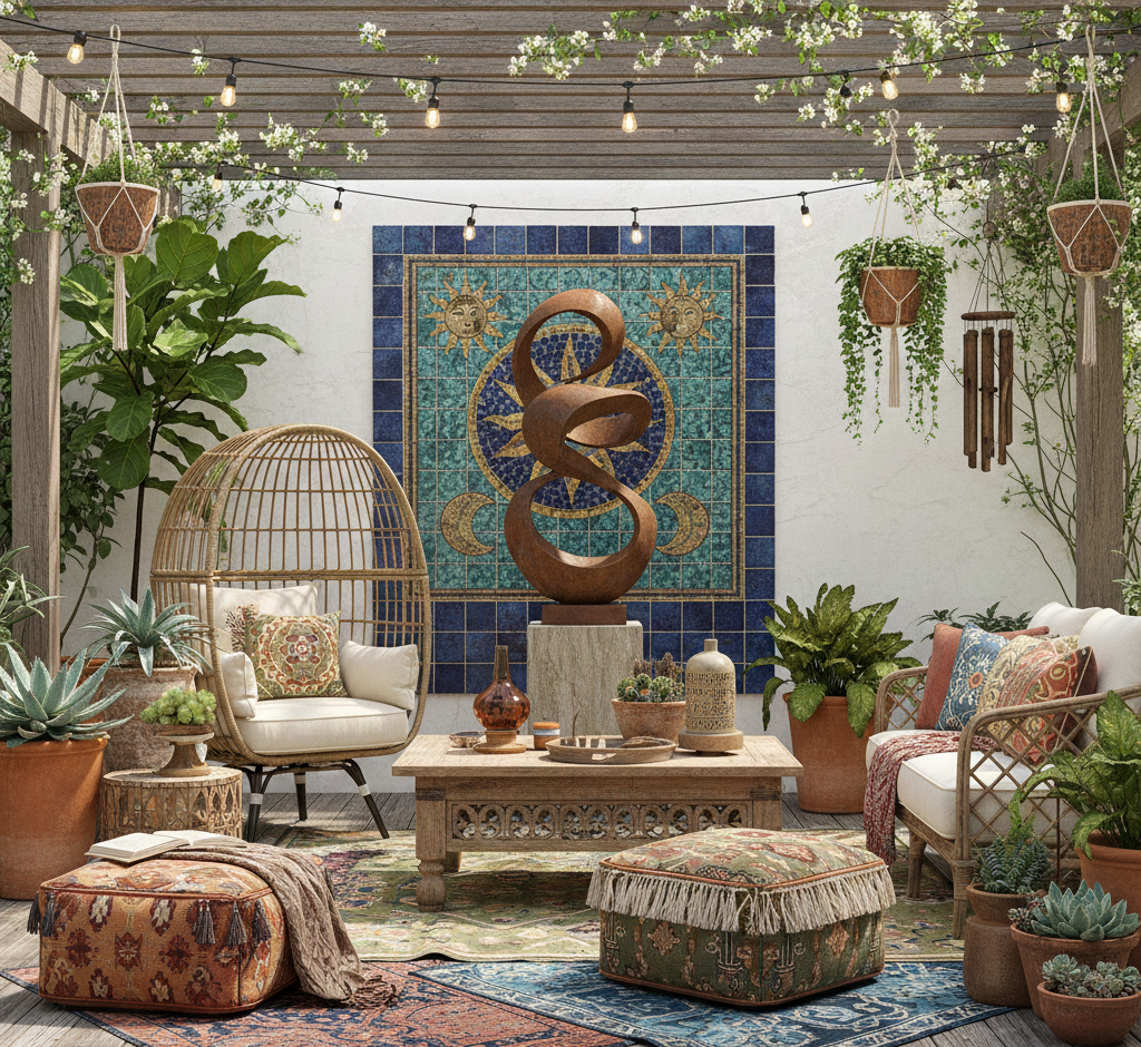 Mix and match patterns, textures, and colors in true bohemian style. Layer rugs, use eclectic furniture, and fill the area with plants to create an inviting and trendy vibe.