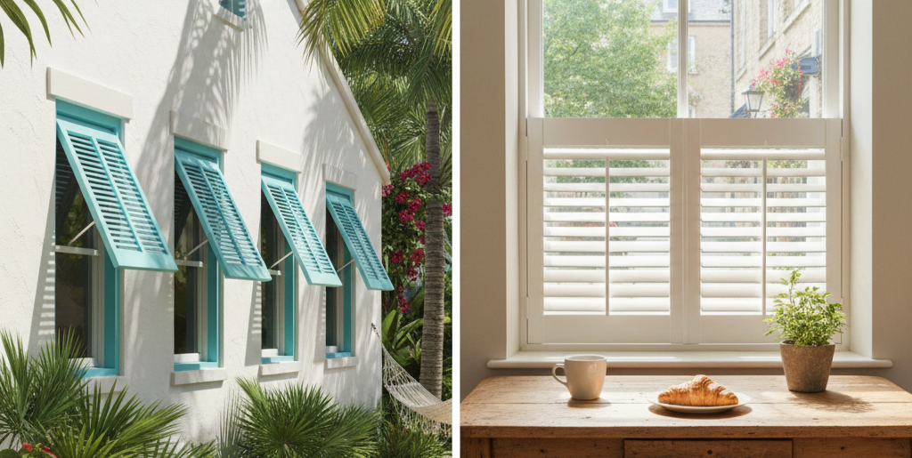 For those who want a tropical vibe, Bahama shutters offer a unique aesthetic. Typically hinged at the top, they swing outward, providing shade and ventilation to your home while adding a charming island flair.