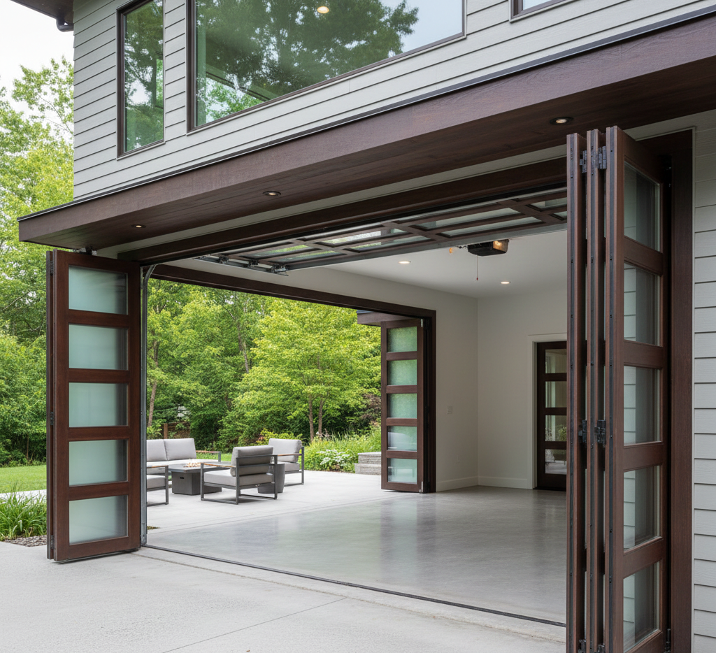 Bi-fold garage doors are a functional and stylish alternative to traditional swinging doors. They fold outwards, maximizing space and creating a dramatic entrance. Perfect for those with wider garage openings, they can seamlessly blend indoor and outdoor living spaces, enhancing your home’s overall flow.