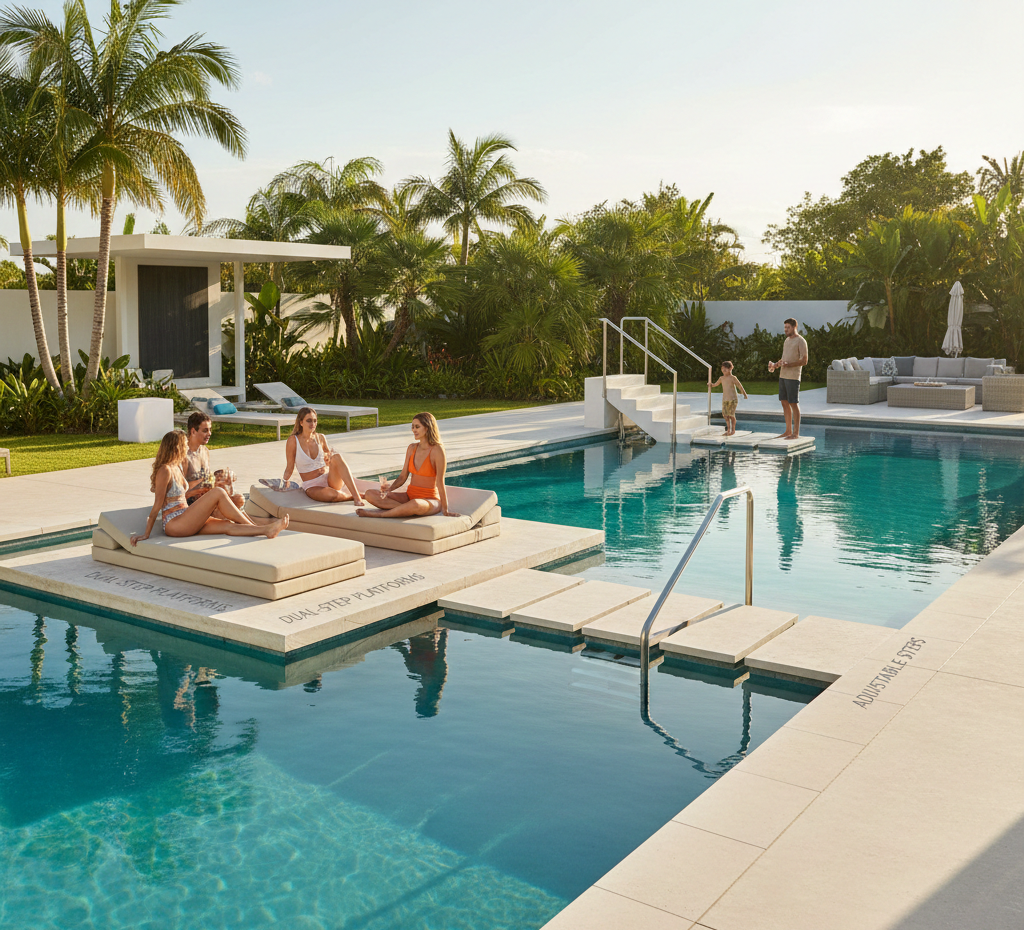 For larger pools, dual-step platforms provide ample space for easier entry and social interaction. Ideal for gatherings, they allow swimmers to lounge comfortably by the pool’s edge.