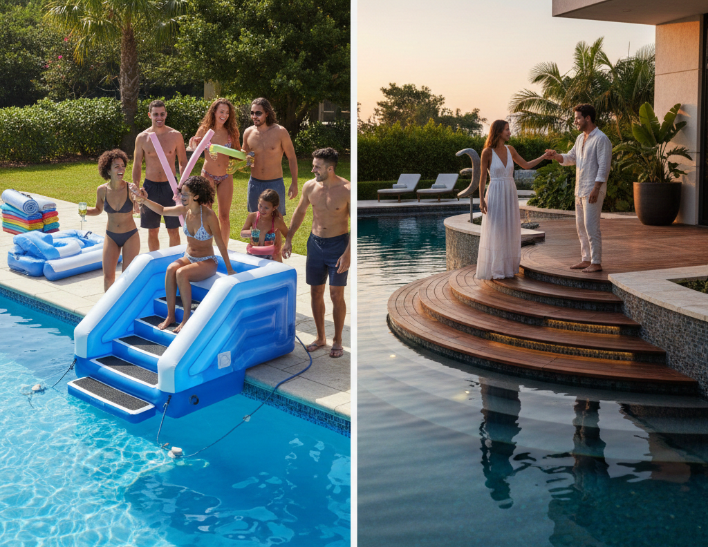 Inflatable steps are a novel idea for occasional swimmers. Easy to store and transport, they provide a fun solution for pool parties and family gatherings.