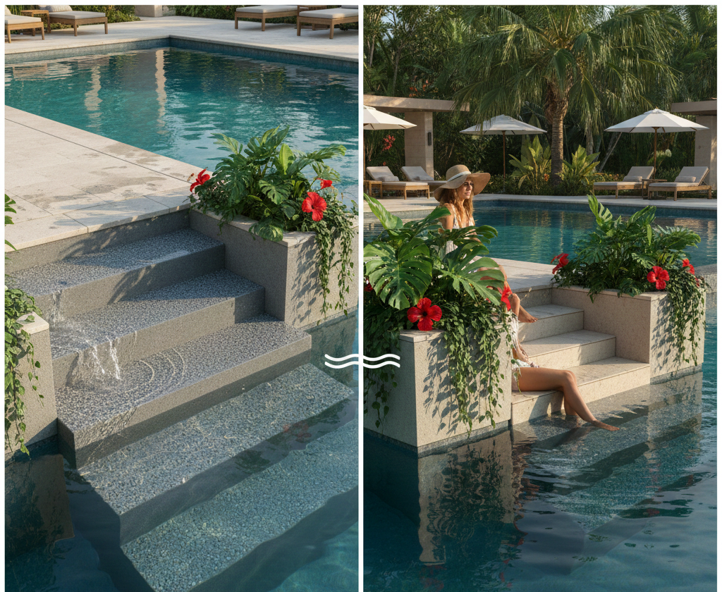 Merge nature and poolside luxury by incorporating built-in planters into your steps. Lush greenery can create a tropical ambiance, enhancing relaxation as you transition to and from the water.