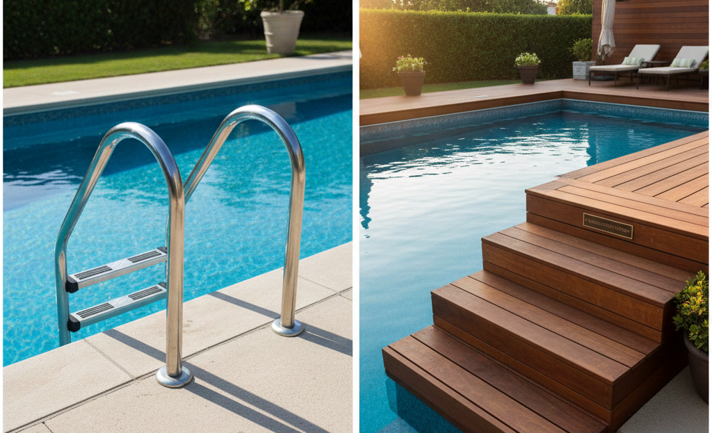For an ultra-modern look, stainless steel steps offer sleek design and unmatched durability. Resistant to rust, they are perfect for saltwater pools and require minimal maintenance.