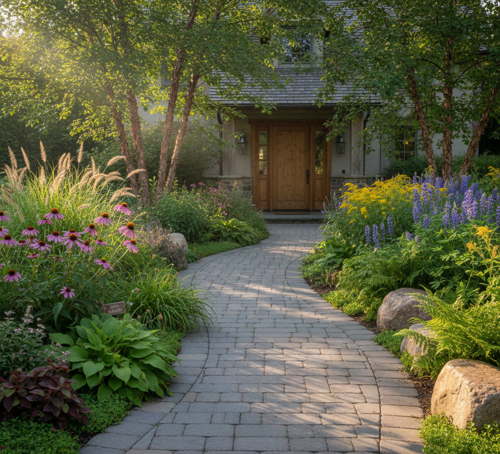 Start with a well-defined pathway made of stone, bricks, or pavers. This approach is one of the most effective front yard landscaping ideas because it naturally guides guests to your front door while creating an inviting atmosphere. Well-planned front yard landscaping ideas like this also enhance curb appeal and add structure to your outdoor space.