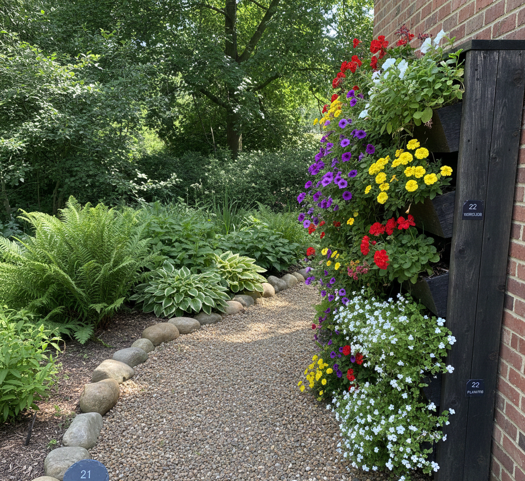 Vertical planters make excellent use of space and can be filled with colorful annuals for a vibrant look.
