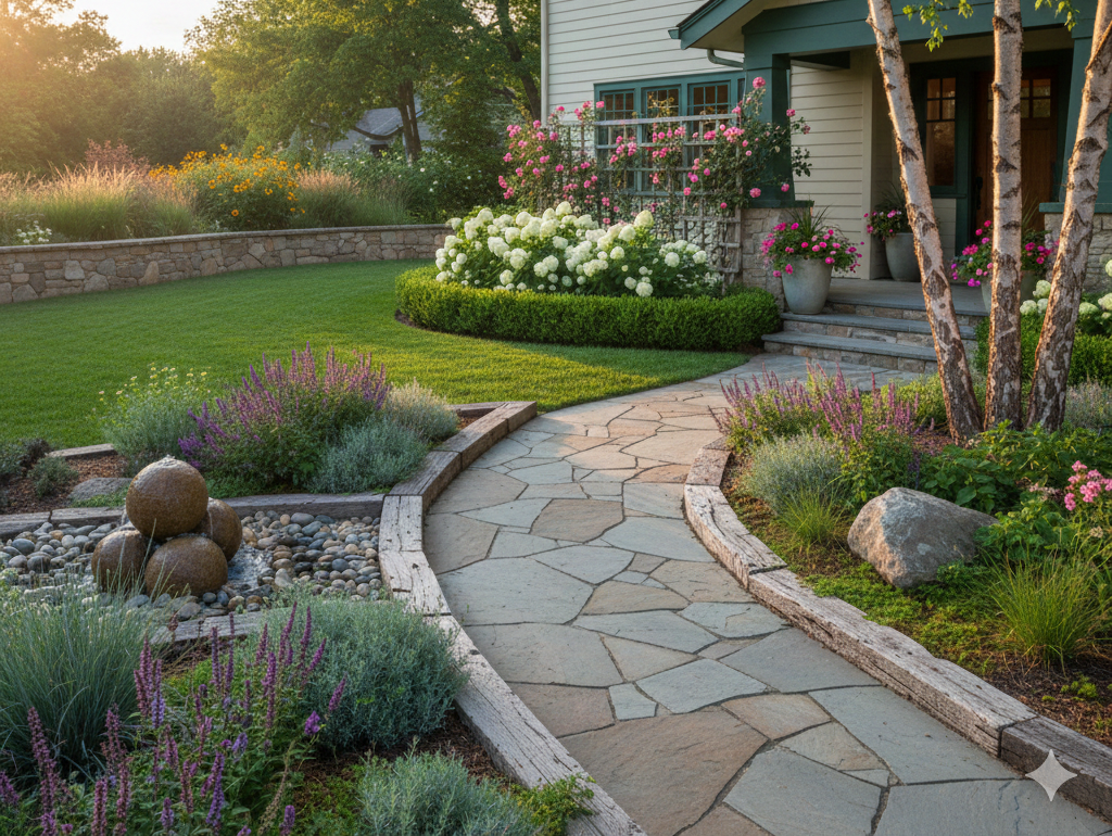 A successful landscape incorporates both hardscapes (paths, walls, patios) and softscapes (plants, flowers) for dynamic aesthetic appeal.