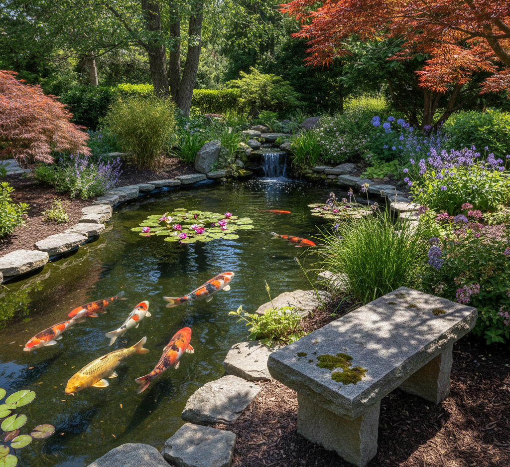 If space permits, a koi pond can become a stunning centerpiece. Colors of koi fish in clean water encourage a tranquil ambiance wherever you look.