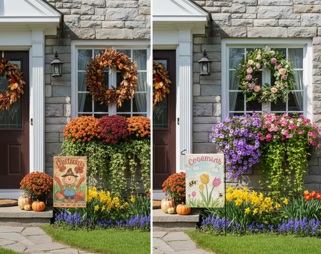 Change decorations with the seasons to keep your yard lively. Use wreaths, thematic garden flags, and decorative pumpkins in fall or vibrant flowers in spring.