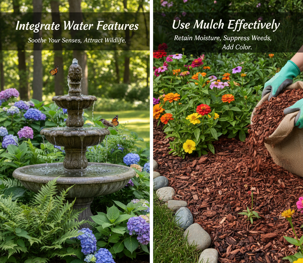 Mulch adds color and retains moisture while keeping weeds at bay. Choose decorative stones or wood chips to match the style of your garden.