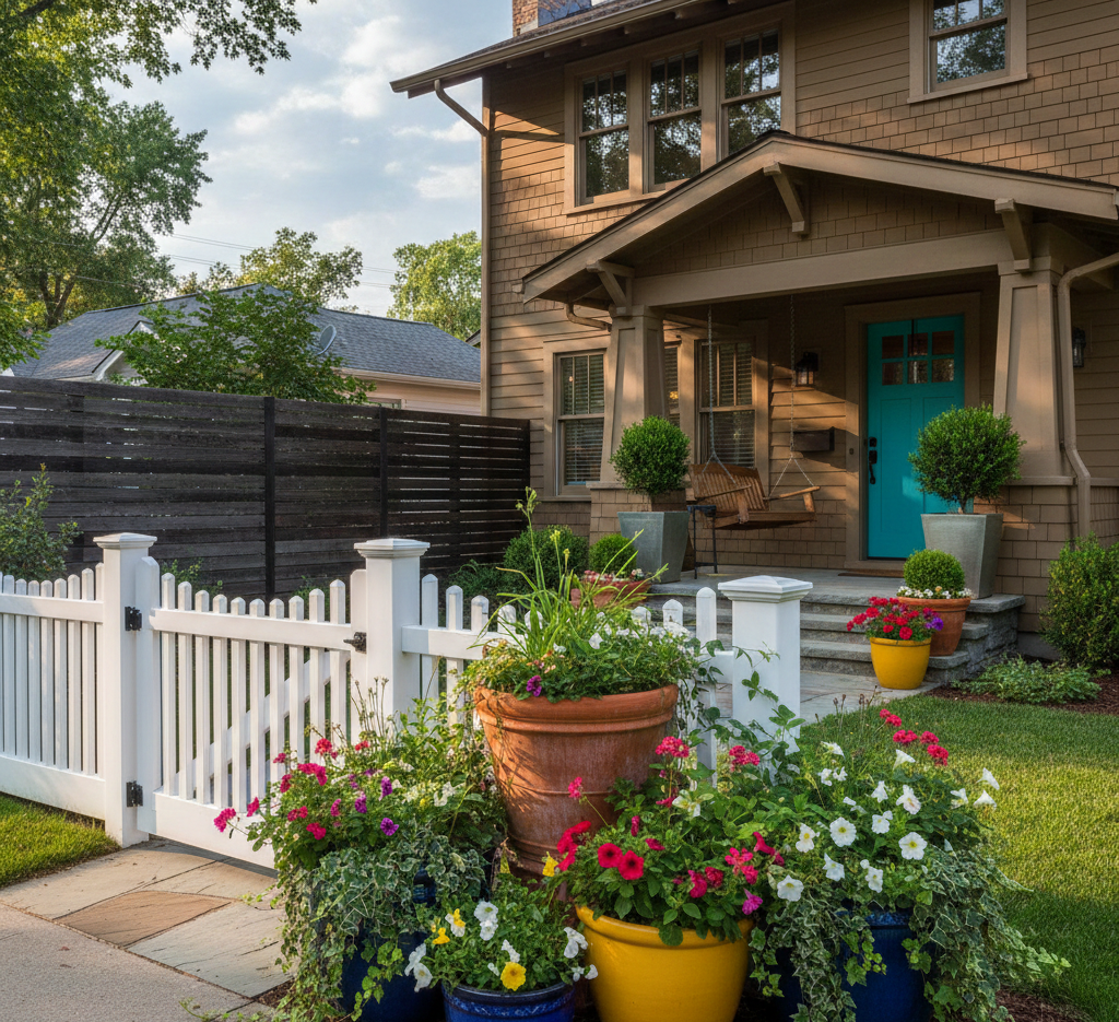 Fencing doesn’t just provide security; it can also add charm to your front yard transformation. Pick a design that complements your home, whether it’s a white picket fence or a modern horizontal slat fence.