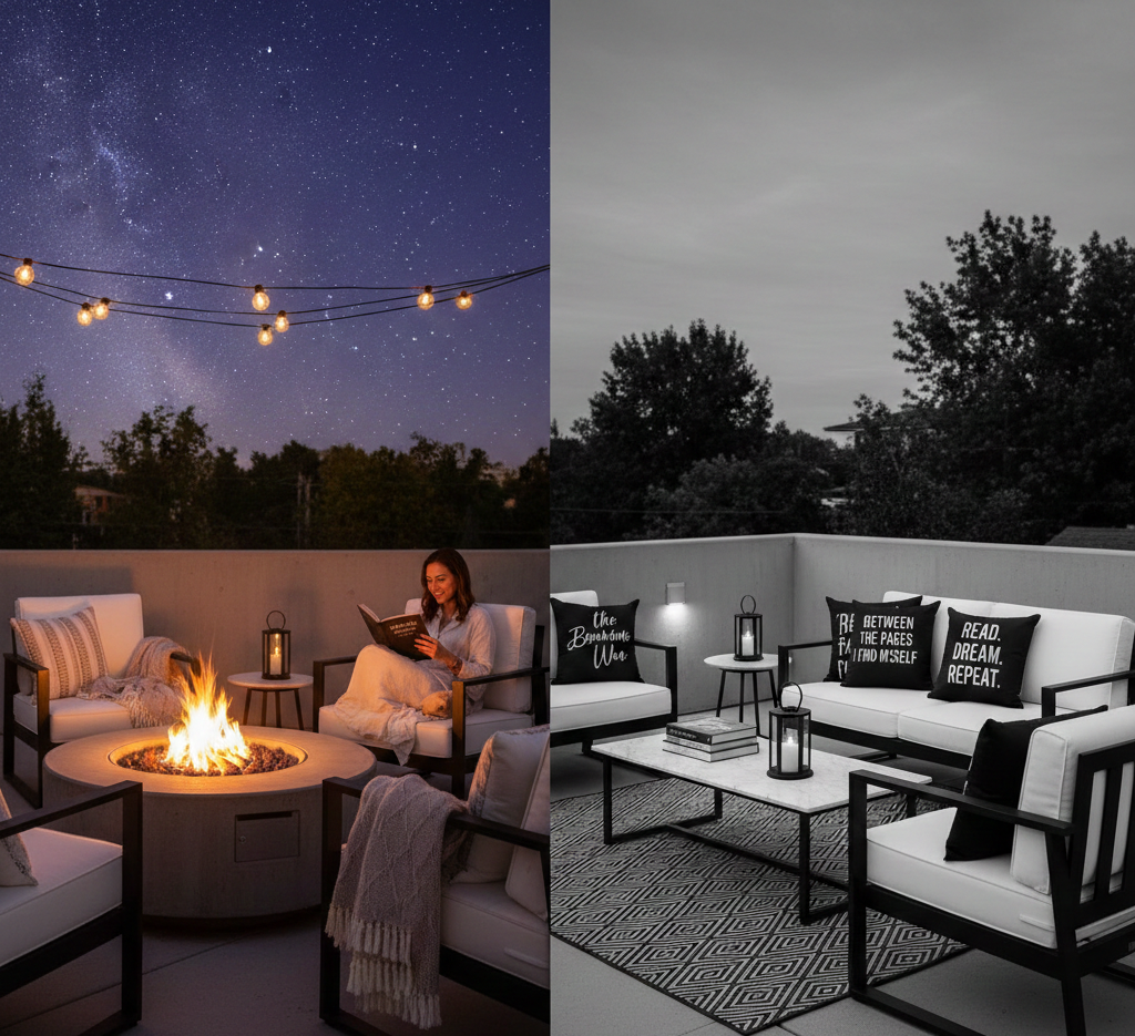 Looking for patio ideas for book lovers? Enhance your outdoor space with a fire pit and imagine curling up with a book under the stars, staying warm next to a crackling fire. This cozy atmosphere makes evening reading truly magical.