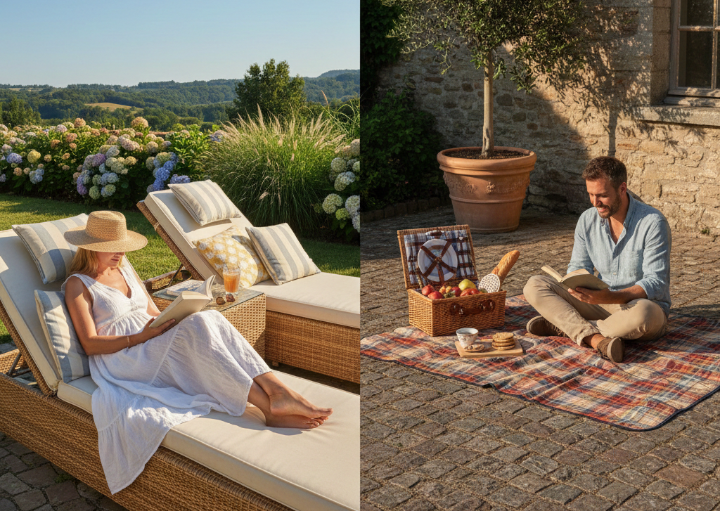 Invest in comfortable sun loungers accompanied by plenty of cushions. Position them to face your garden or a beautiful landscape—perfect for soaking in the sun while getting lost in a good book. These are some of the best patio ideas for book lovers to create your ideal reading retreat.