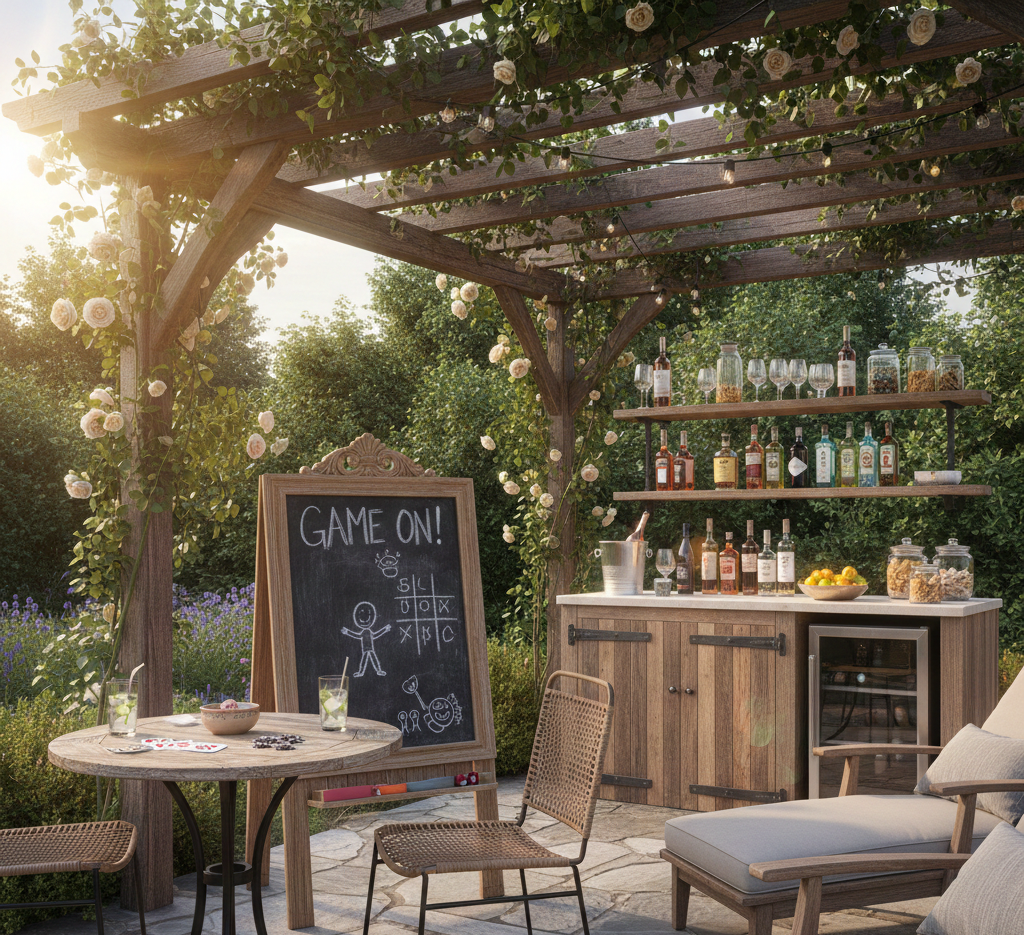 Add a playful element to your pergola with a games area. Whether it’s a small table for cards, or a chalkboard for doodles, incorporating games can foster camaraderie and fun during gatherings.