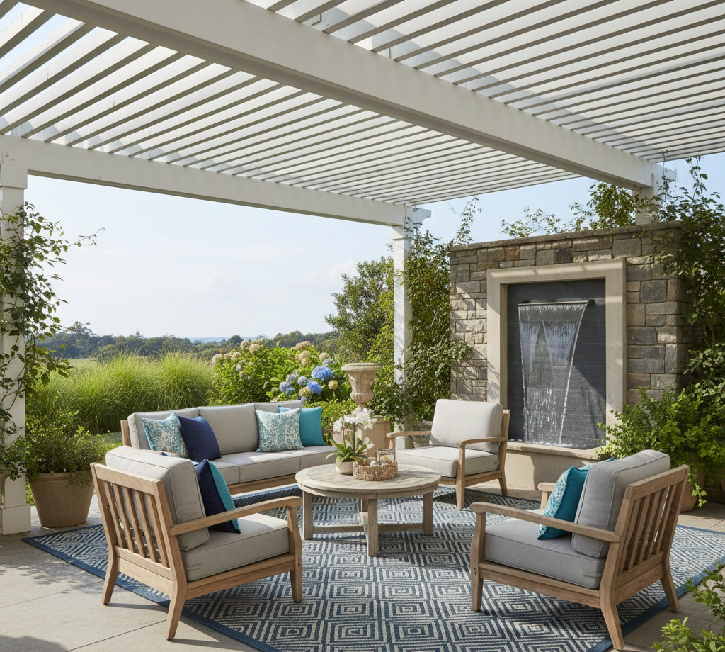 Define your seating area with an outdoor rug that complements your decor. A well-placed rug adds warmth and texture while tying the whole space together. Opt for outdoor-safe materials that can withstand the elements to keep your pergola looking fresh.
