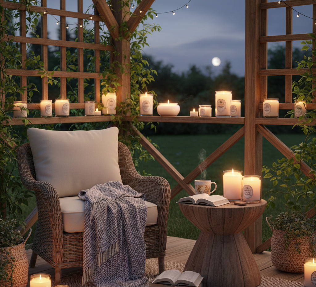 Set the mood of your pergola with aromatic candles. Choose scents that complement the outdoor environment, like citrus, coconut, or lavender. Candles not only serve as decor but also add an enchanting ambiance during the evenings.