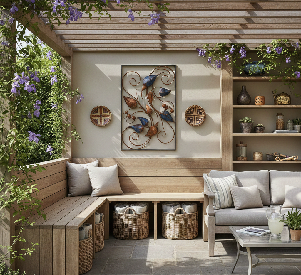 Enhance the walls of your pergola with art pieces or wall hangings that reflect your personality. Whether it’s a captivating mural, metal art, or handcrafted pieces, wall decor adds character and visual interest, making your space feel uniquely yours.