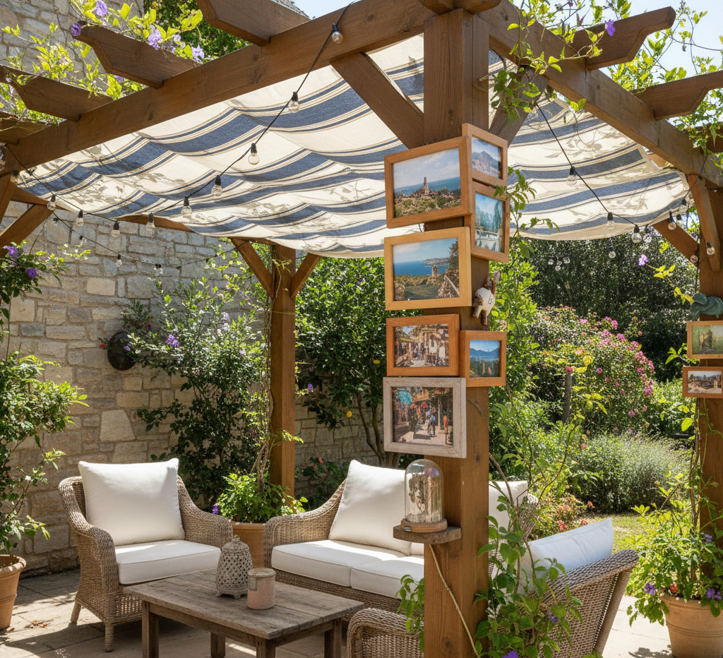 Incorporate personal touches by adding framed photos or mementos from your travels. Hang pictures on the pergola walls or place them on shelves to evoke cherished memories while enhancing the space’s warmth.