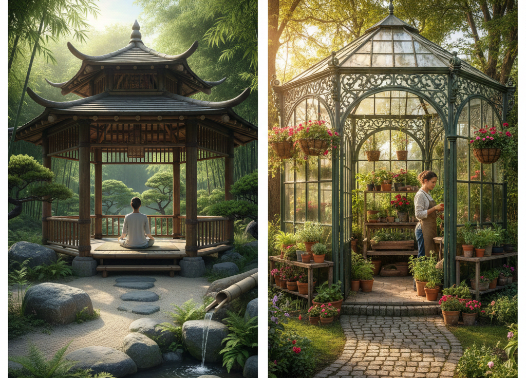 For a tranquil escape, opt for a zen garden gazebo. Incorporating bamboo and natural elements, this design provides a peaceful area for meditation and mindfulness amidst nature.