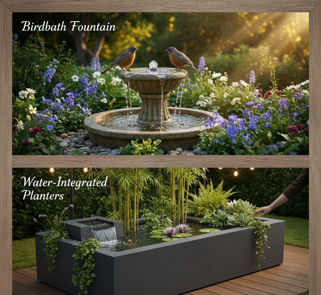 Create a unique look with water-integrated planters. These planters have a small water feature incorporated, allowing plants to thrive while enjoying the calming sound of water features. They are perfect for smaller spaces, such as patios or balconies.