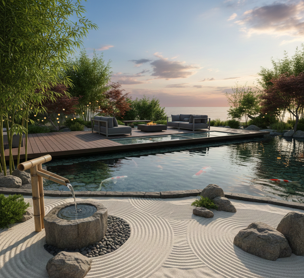 A Zen garden featuring minimalistic water features can provide a peaceful space for meditation. Incorporate raked sand, stones, and small water features like a bamboo fountain to encourage relaxation and reflection.