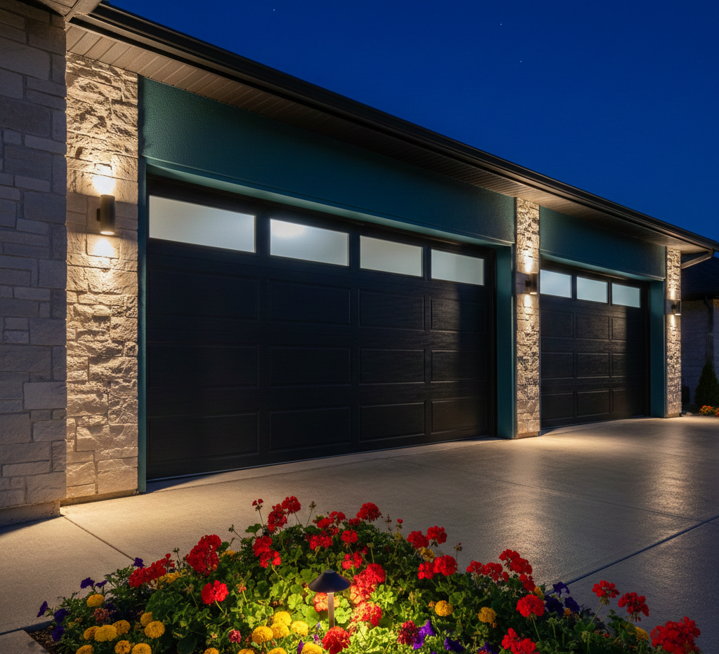 Highlight your stylish black garage door with landscape lighting. Strategically placed lights can draw attention at night, accentuating the door’s grandeur and improving safety.