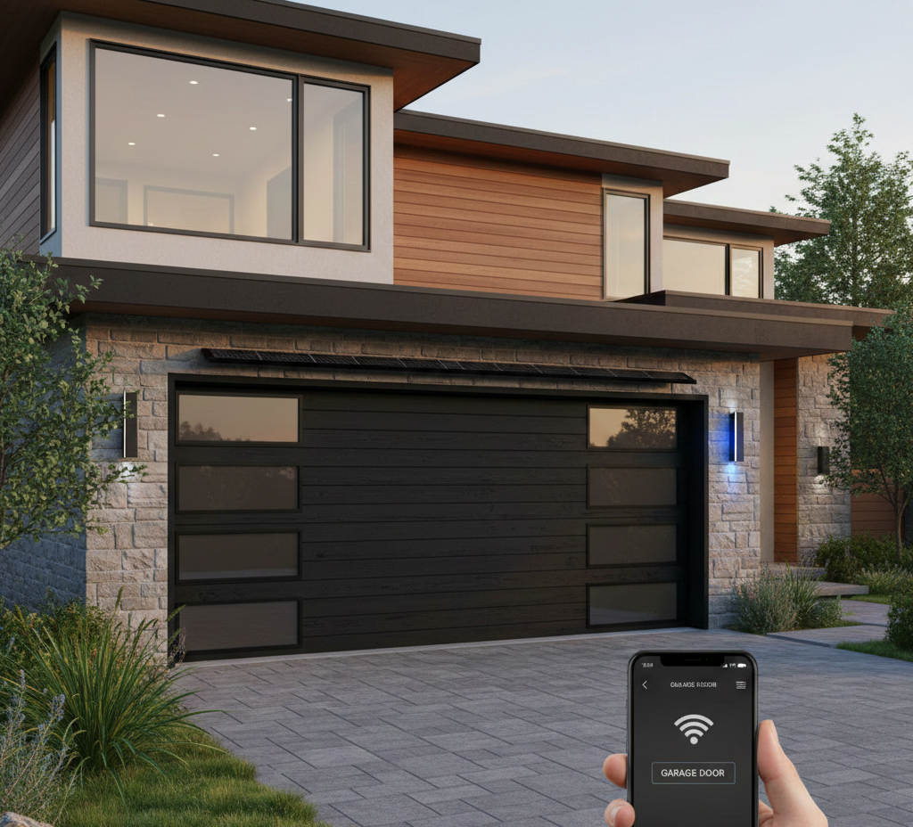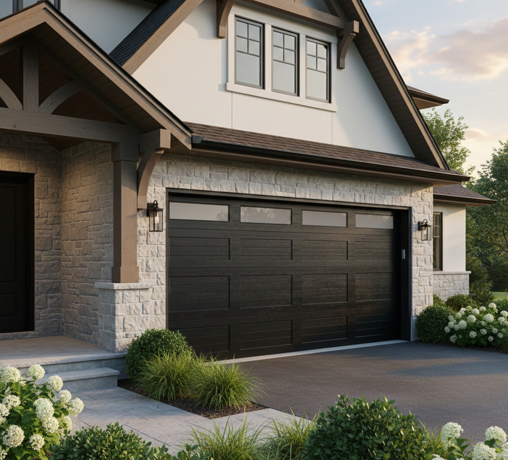 Modernize your black garage door with smart technology. Remote-controlled doors not only add convenience but also a contemporary feel to your home’s exterior.