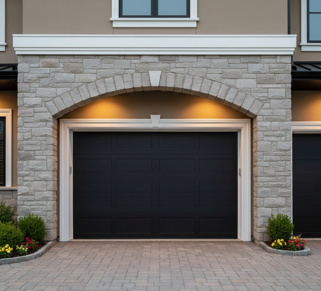 A striking black garage door pairs beautifully with lighter siding or stonework. This contrast not only emphasizes the door but can also make your home appear more grounded and sophisticated.