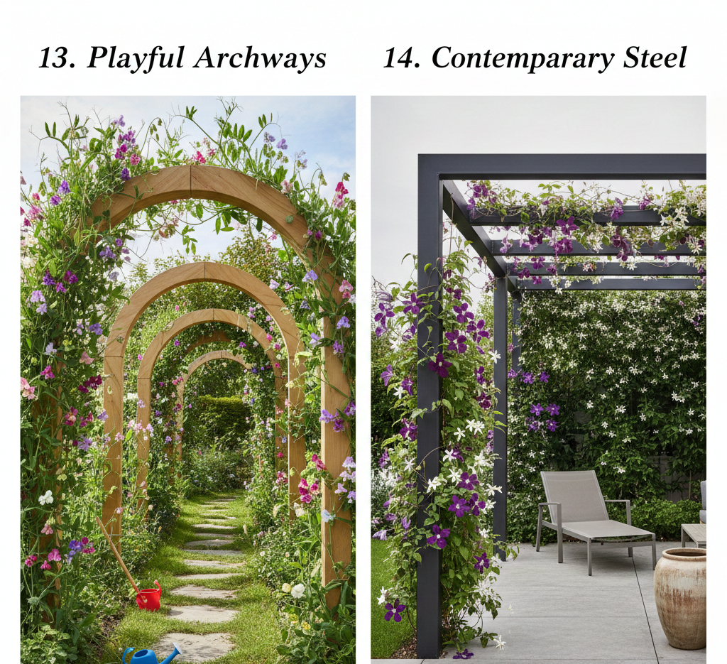 Add playful arches to your pergola and plant vibrant climbing vines such as sweet peas. This whimsical touch is perfect for a family-friendly garden where nature encourages imagination.