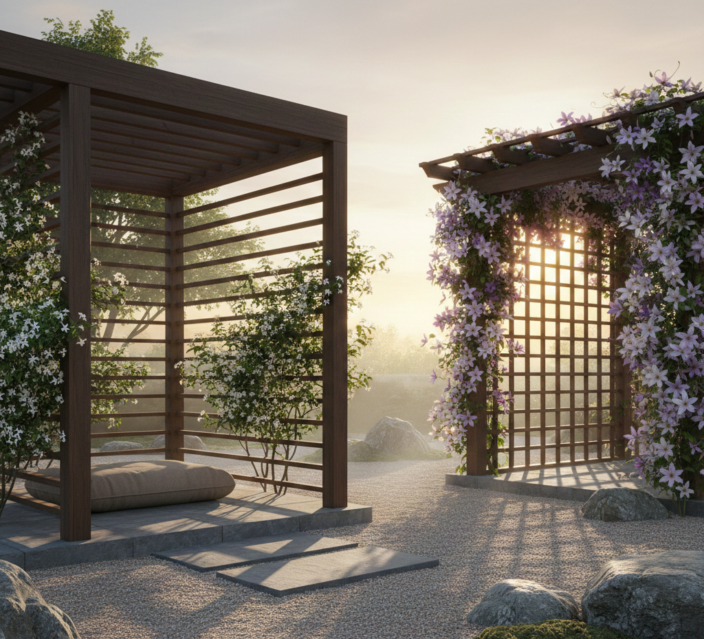 A minimalist pergola set within a rock garden accompanied by delicate trellis plants like jasmine offers a serene place for meditation and relaxation. The calming scents will enhance the peace you seek in your outdoor space.