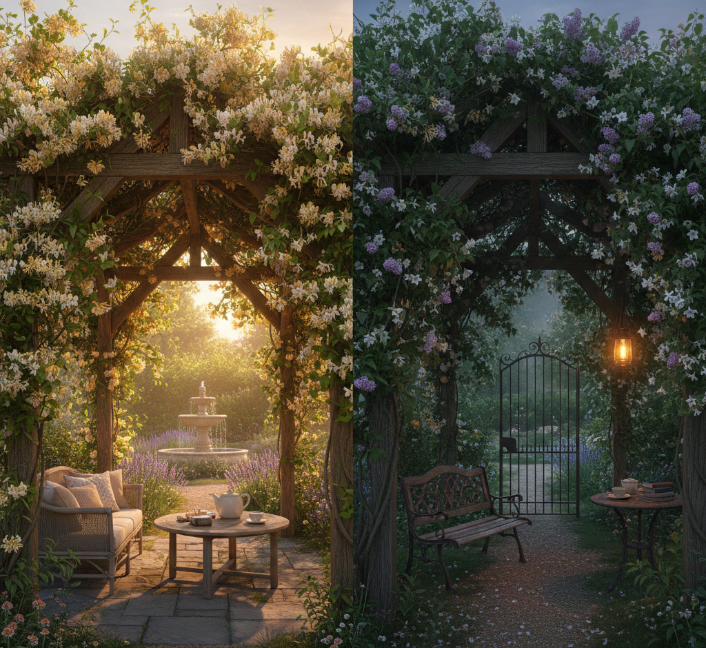 Envision a quaint wooden pergola cloaked in foliage and soft petals of jasmine and lilac. This design mimics a secret garden, ideal for romantic evenings or solitary reflection.