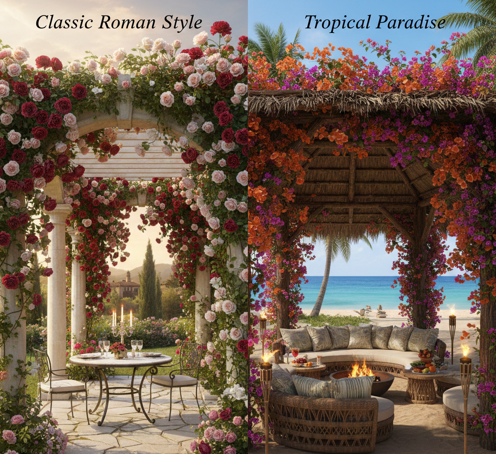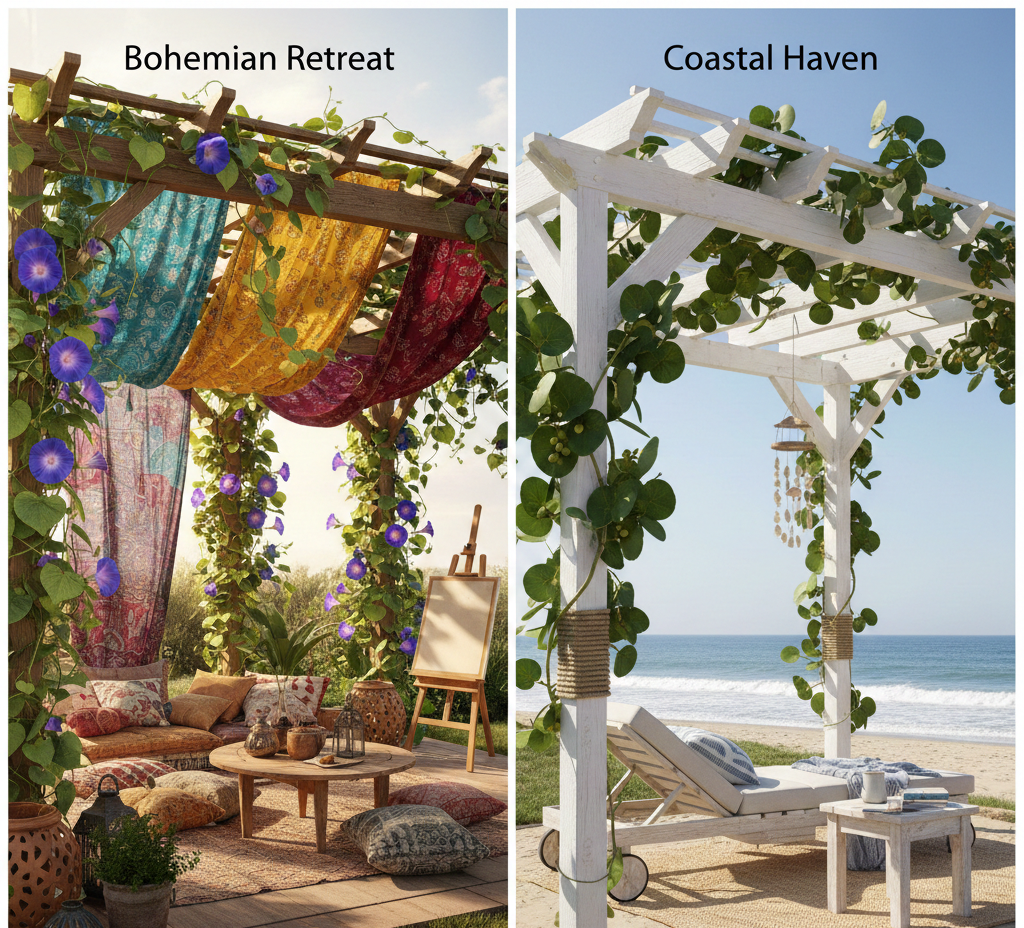 For those near the shore, a coastal-themed pergola featuring beachy materials and sea grapes as climbing plants creates a calming atmosphere reminiscent of seaside relaxation.