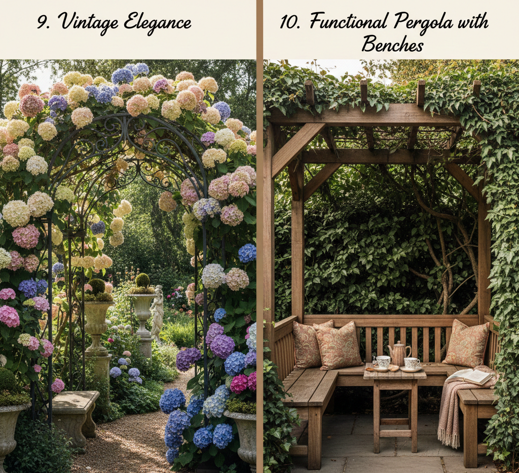 A wrought-iron pergola decorated with climbing hydrangeas encapsulates vintage elegance. This design pays homage to classical gardens while offering beautiful blooms in hues ranging from soft pink to vivid blue.