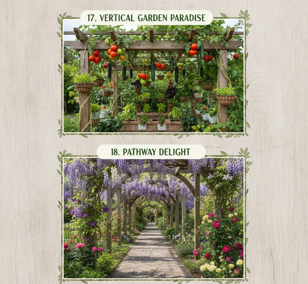 Transform your pergola into a vertical garden filled with trellising tomatoes, cucumbers, and other edibles. This practical design yields delicious benefits while maintaining an attractive aesthetic.