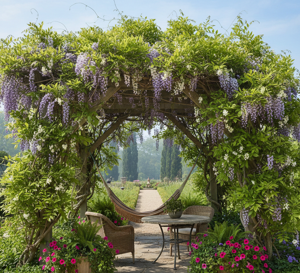 Pergola Ideas: Transform your pergola into a botanical haven. Drape climbing vines, such as wisteria or jasmine, around the structure, allowing their natural beauty to create an enchanting atmosphere. This not only adds visual interest but can also provide natural shade.