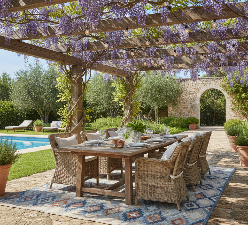 Consider these Pergola Ideas: place a dining table under your pergola to create an ideal space for al fresco dining. Pair it with a stylish outdoor rug to define the dining area and create a cohesive look.