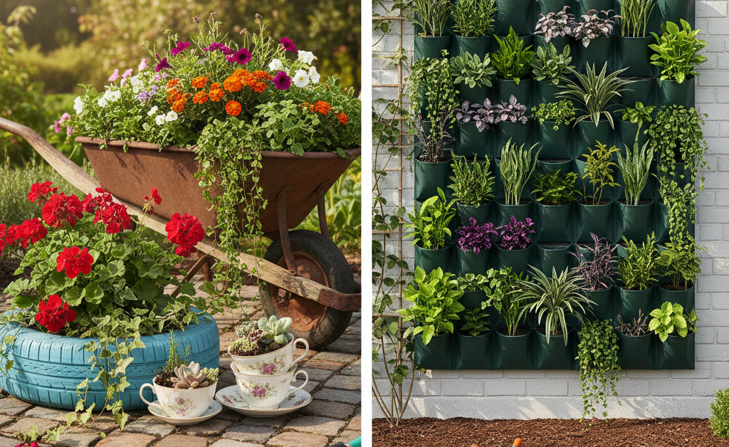 Think outside the box—old tires, teacups, or even wheelbarrows can be transformed into unique planters that tell a story and add a personal touch to your garden.