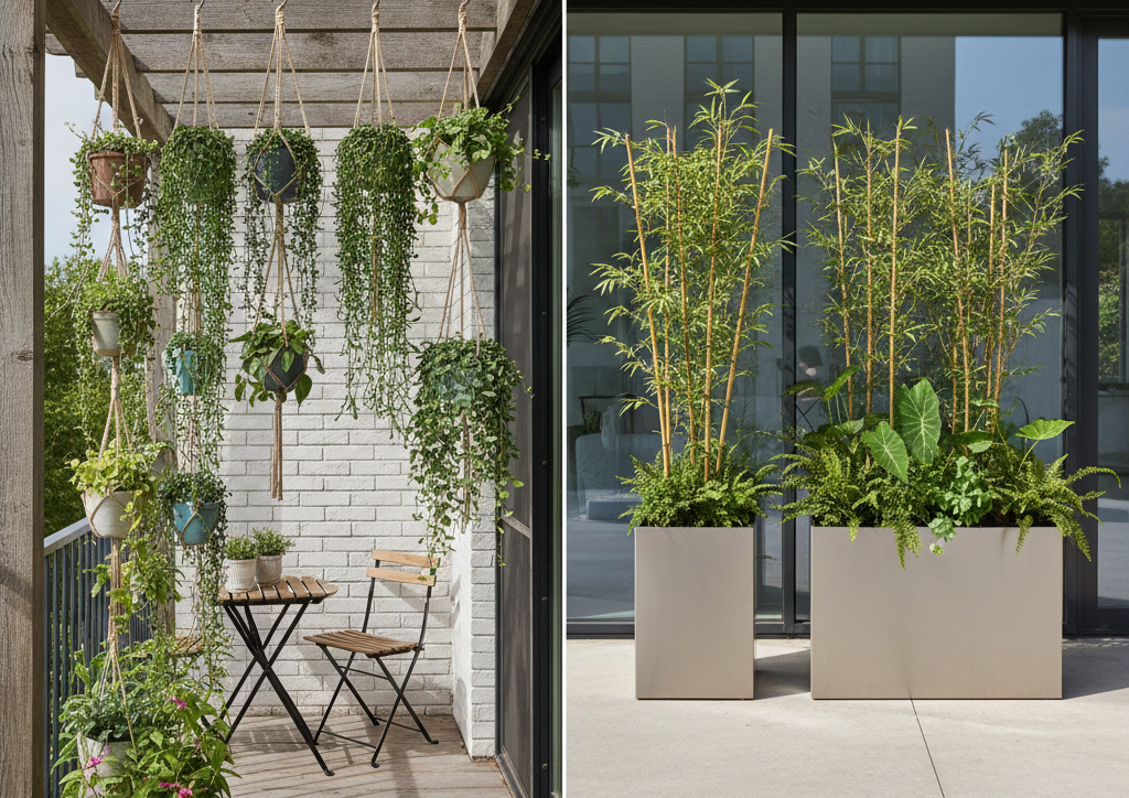 Maximize your space with hanging planters. Ideal for small balconies or patios, these vertical garden solutions not only save space but visually expand your outdoor area.