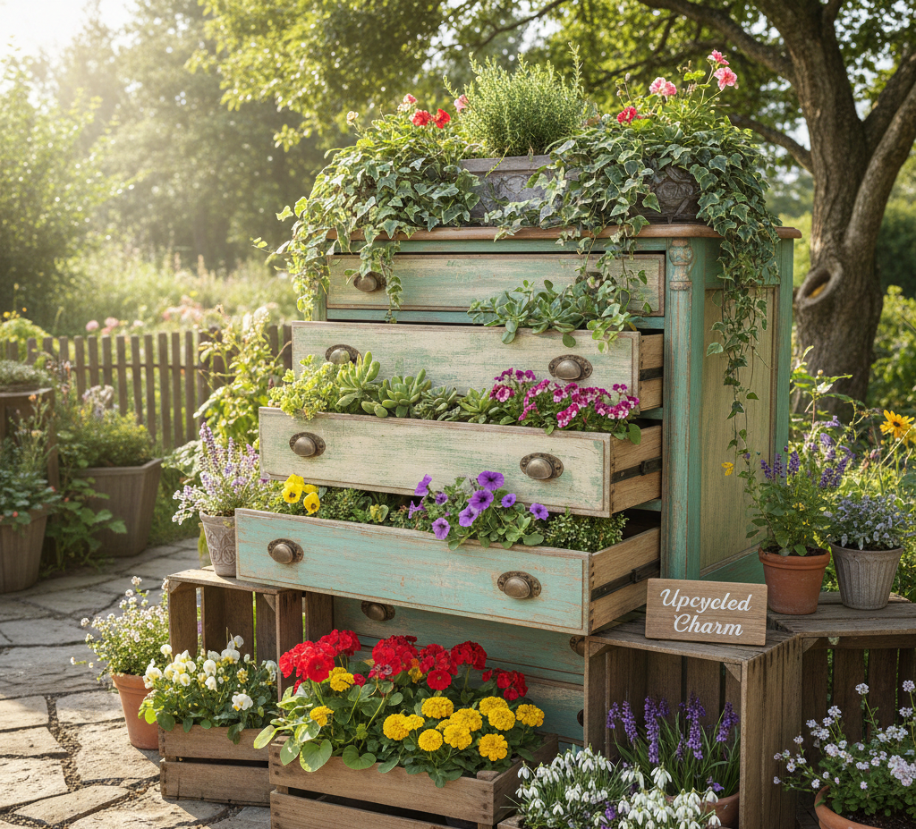 Convert old furniture into planters by repurposing dressers or wooden crates. This unique approach adds personality and charm to your outdoor space.