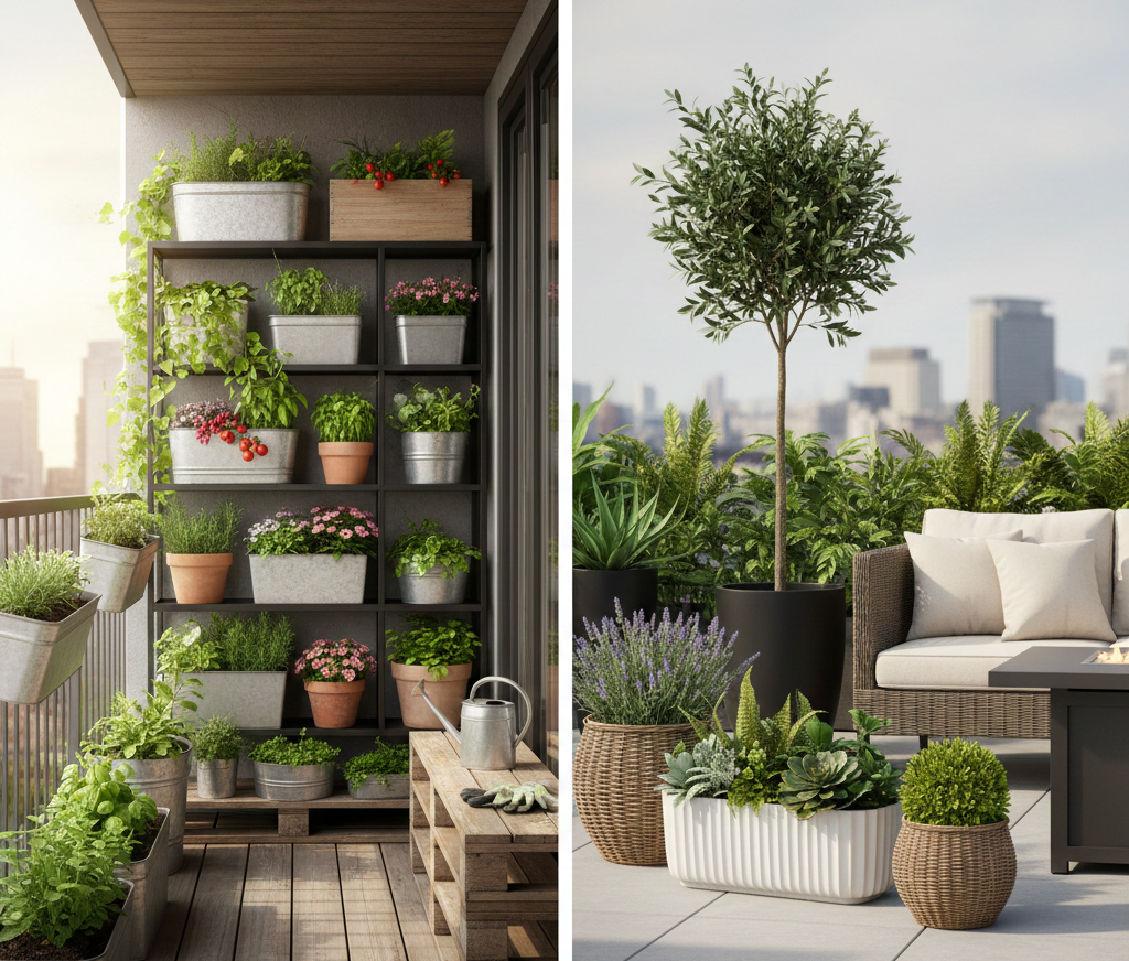 Turn your small outdoor space into an urban container garden with a variety of planters stacked and arranged creatively. This approach maximizes your planting options and creates a lush environment.