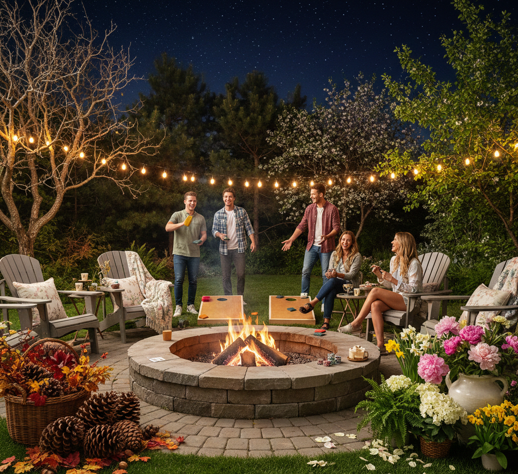 Rotate your fire pit decor with the seasons. From autumn leaves and pinecones in fall to fresh flowers and greenery in spring, changing your decorations keeps the atmosphere fresh and engaging year-round.